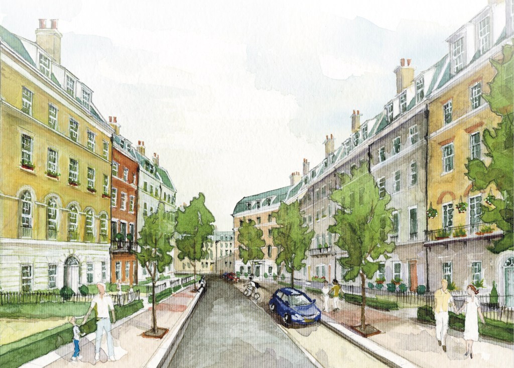 The argument in the report goes that property owners should be able to come together to agree on coordinated re-development scenarios for suburban streets, and if this is ratified through a street vote, then planning permission should not be required. The promise held out, as depicted on the cover, is that somehow our sprawling suburban streets will transform into bits of Georgian London as part of a utopian world where: all agree on the proposition, all benefit from the execution, and the market delivers up the perfect solution to our housing crisis – new more dense and beautiful development.