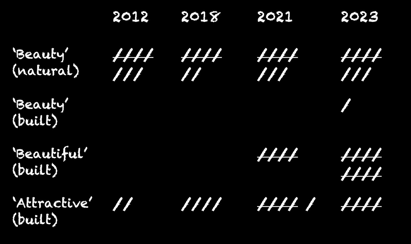 In 2012 and 2018 the term ‘beauty’ was reserved exclusively for scenic or natural beauty, being used eight times in NPPF (not including the glossary), while the term ‘beautiful’ was not used at all. Instead, the aspiration for an aesthetically pleasing built environment was described through the term ‘attractive’, a term used twice in 2012 in relation to the built environment and once in the different sense of being economically attractive.