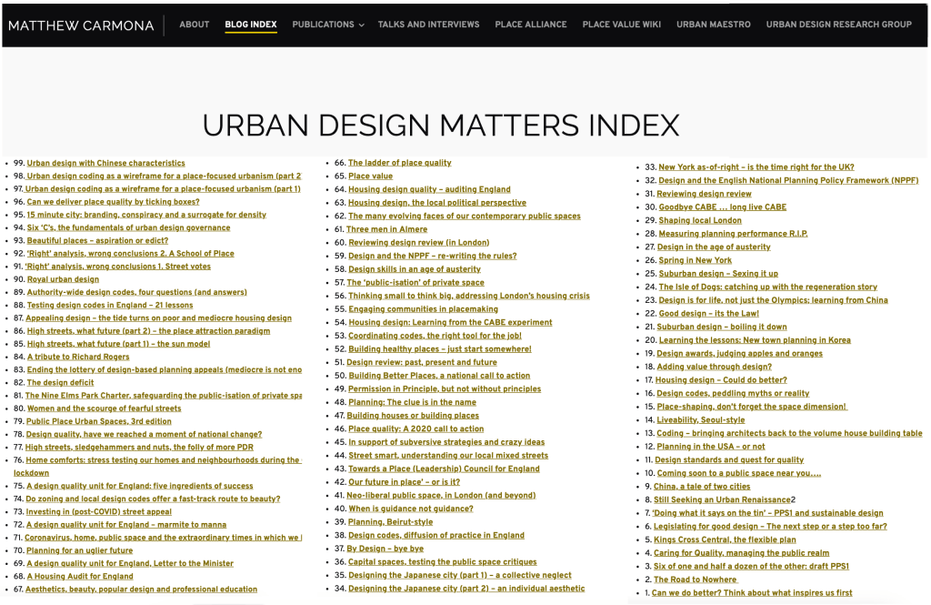 Just over twenty years ago Nick Matthews, Editor of Town and Country Planning, asked me if I would write a quarterly column for the magazine. I called it Urban Design Matters. A little later, and rather late to the blogging party, I began publishing the contributions in an obscure corner of The Bartlett website and after that at https://matthew-carmona.com (where you are now). This contribution makes 100 blogs and provides a good excuse for a bit of reflection.