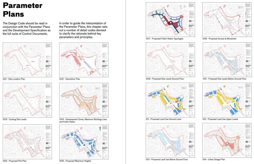 As published, the sitewide codes begin with fourteen parameter plans, dealing with everything from development zones and building lines, to building heights, land uses, access and movement, and public realm typologies. These sit alongside a separate ‘development specification’, setting out the maximum quantum of development for each development zone and its type, a design and access statement, and the illustrative masterplan (illustrative because it will inevitably need to flex over the 20 year build out).